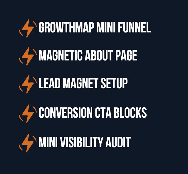 You’ll get a step-by-step funnel plan to turn visitors into buyers (GrowthMap Mini Funnel), an About page that builds trust and drives action (Magnetic About Page), a polished opt-in setup that grows your email list automatically (Lead Magnet Setup), custom call-to-action sections placed where they’ll actually get clicks (Conversion CTA Blocks), and a documented UX, website and social media audit showing exactly how to improve your visibility online (Mini Visibility Audit).
