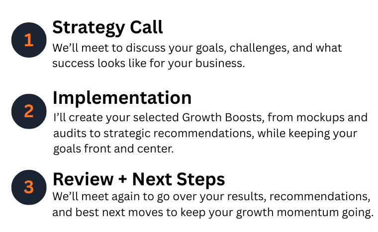 That’s why I built the Business Growth Boost: a bundle of the five step analysis I keep delivering over and over behind the scenes. This is the exact work I’ve done to help clients boost conversions, build trust, and grow their list, without burning out or rebuilding from scratch.
